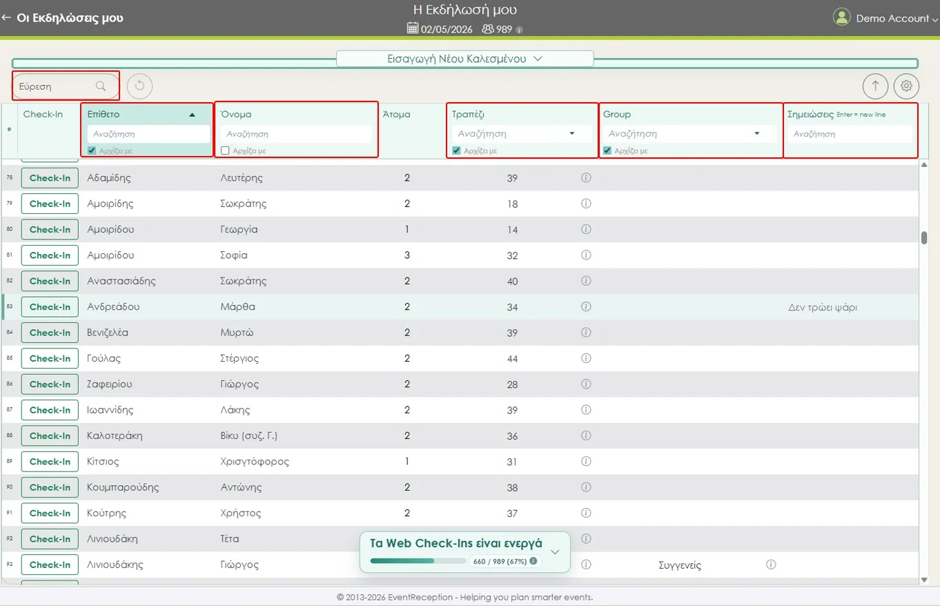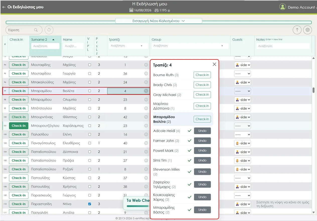 Τα Web Check-ins περιλαμβάνουν όλες τις αγαπημένες δυνατότητες των tablets (ταχύτατη εύρεση, ανάλυση καλεσμένων ανά τραπέζι, μπάρα προόδου αφίξεων κλπ), ενώ είναι ακόμη πιο ενισχυμένα με: