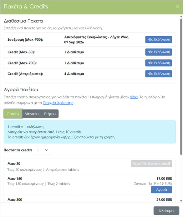 Αγοράστε κατευθείαν μέσα από τον λογαριασμό σας είτε μία εκδήλωση (event credit) είτε ένα μηνιαίο ή ετήσιο πακέτο εκδηλώσεων, που σας δίνει τη δυνατότητα δημιουργίας απεριόριστων εκδηλώσεων.