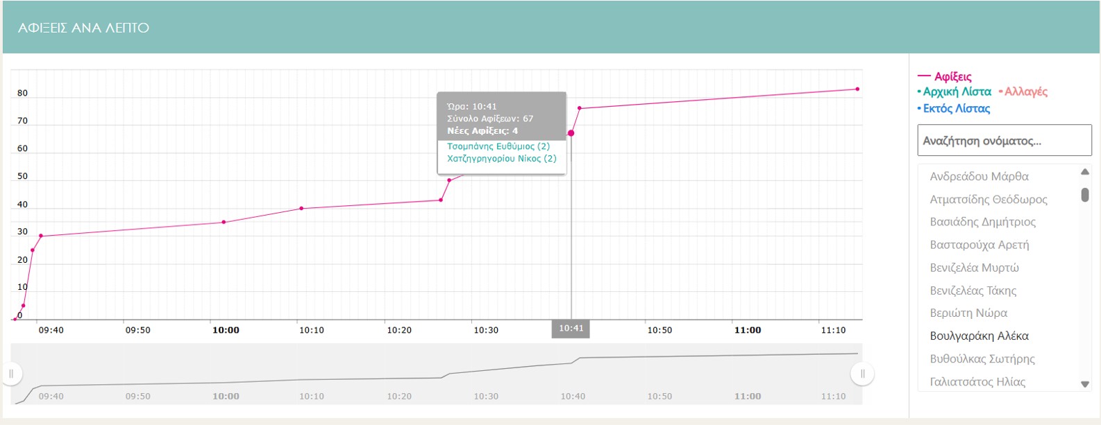 Σε περίπτωση που ο καλεσμένος έχει έρθει, εμφανίζεται αυτόματα και στο γράφημα, οπότε βλέπετε αμέσως όλες τις λεπτομέρειες: Πόσοι/ποιοι είχαν έρθει στο ίδιο λεπτό, πόση κίνηση είχε η υποδοχή εκείνο το διάστημα, αν είχε έρθει στην αρχή, μέση, ή στο τέλος της εκδήλωσης κλπ.
