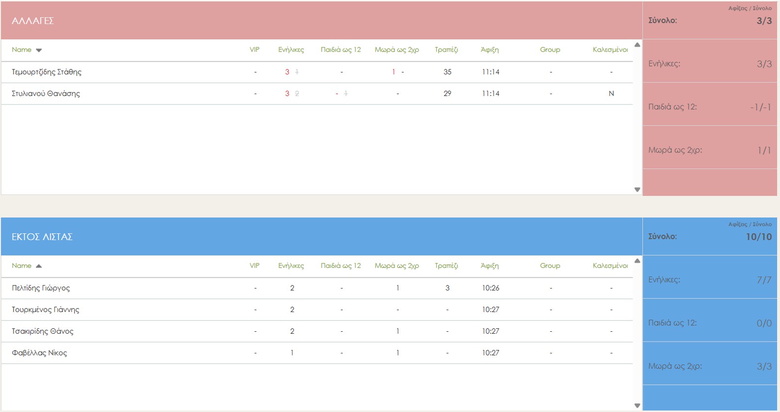 Οι πίνακες Αλλαγές και Εκτός Λίστας διαχωρίζονται πλέον σε Αφίξεις και Σύνολα καλύπτοντας έτσι και ακραία σενάρια, όπως πχ. να έρθει κάποιος καλεσμένος εκτός λίστας, αλλά τελικά να μην γίνει check-in.