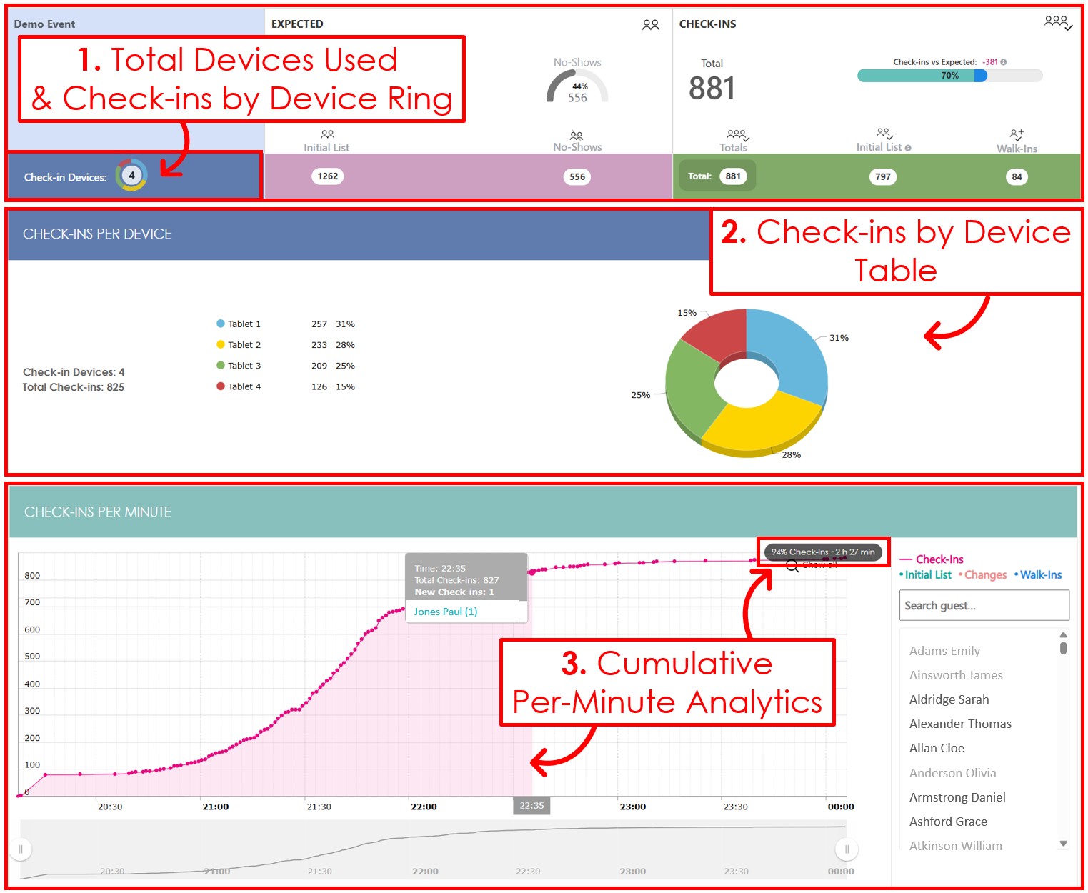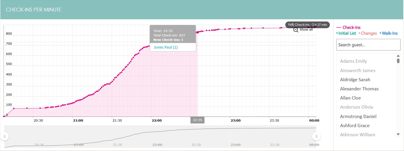In the example above, Jones Paul was checked in 2 hours and 27 minutes after the first check-in. At that point, 94% of check-ins were complete.